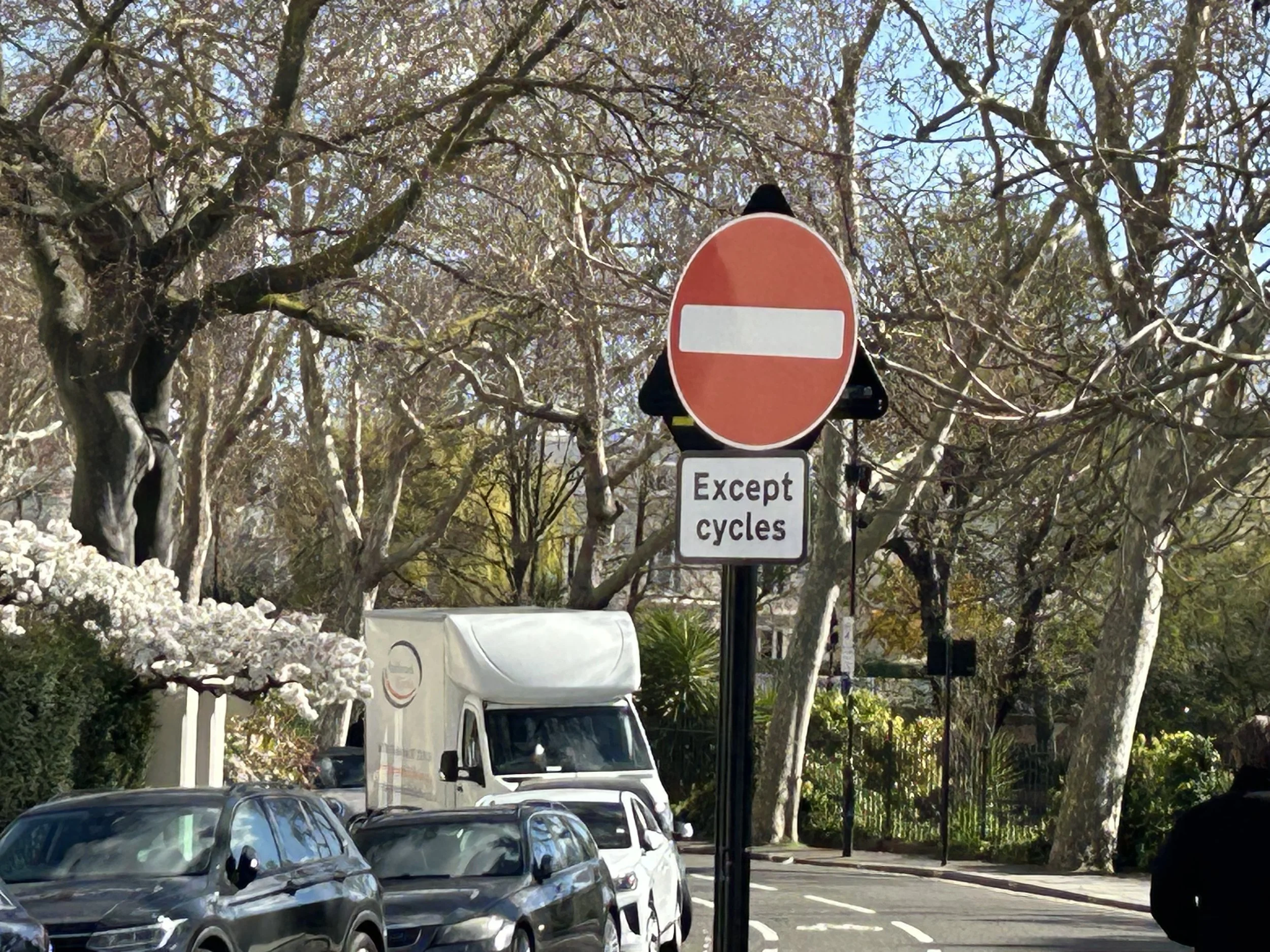 Leaving Grand Junction, it is now possible to cycle eastbound, thanks to two new contraflows: Delamere Terrace and Blomfield Road. Both have recently been made two-way for cycling, and are extremely pleasant to pedal along. (Perhaps the only thing more pleasing than cycling along these roads, is seeing a “No Entry” sign at one end for motor traffic, and then the sign underneath that says “Except cycles”. The official response to this, by the way, is: Megalolz).
