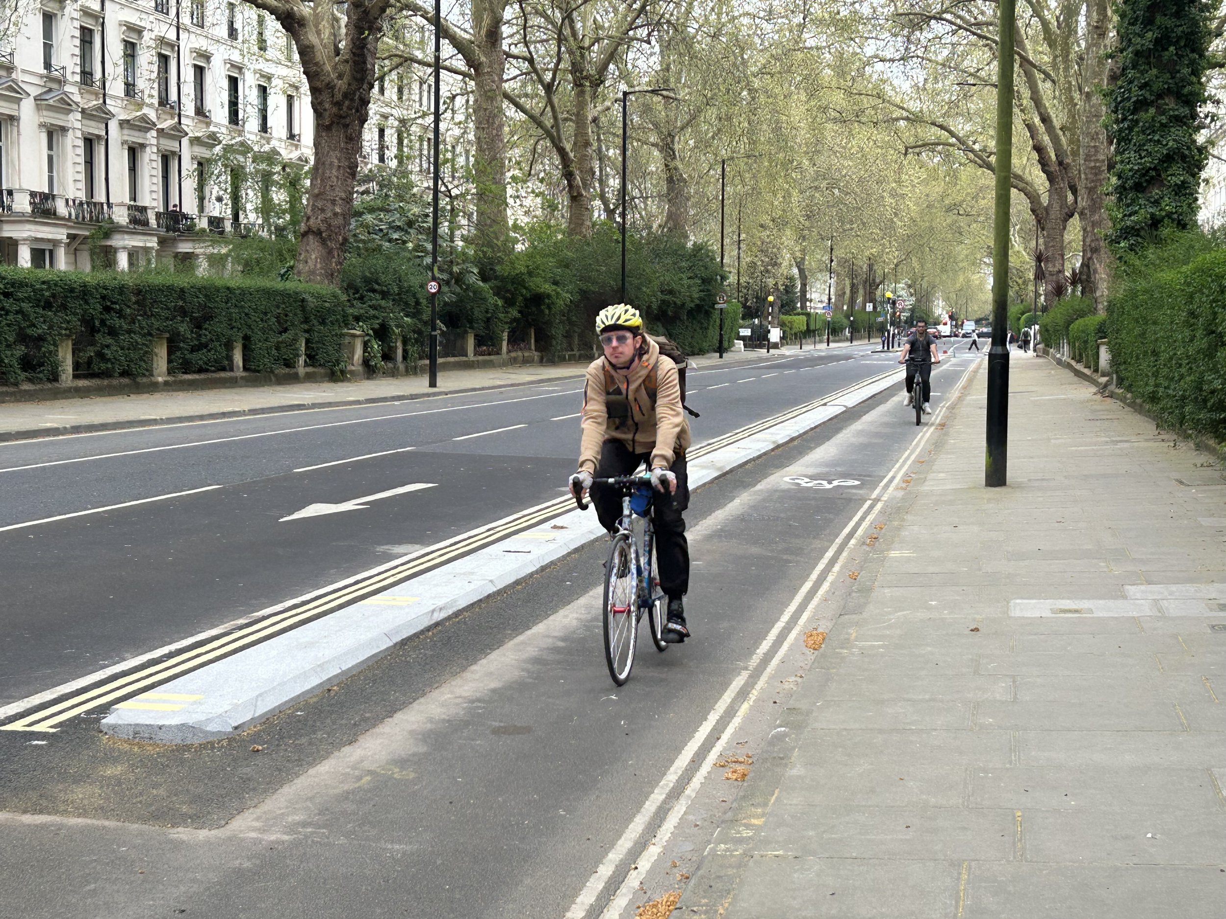 Take a trip along Westbourne Terrace on a bicycle, and you can see that now we’re really in business. There’s a brand new cycle lane, with a proper kerbed separation from the road – the first one the council has put in in years. (There’s one already on one section of this road, but it was put in by TFL – and a good while ago, when Boris Johnson was Mayor). This cycle track is truly glorious to ride along, and once it’s completed, will be along most of this lengthy road. The protection made me feel completely safe. Obviously I had to briefly park my bike, lie on the middle section and check the height of the kerb, and it was as tall as my index finger.