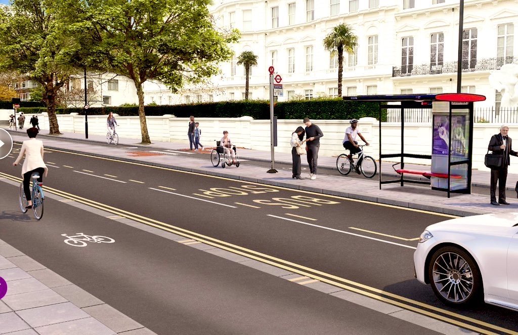 Cycling along Stanhope Place towards Hyde Park, there’s a dedicated cycle crossing to get across Bayswater Road. (Which has been there a while). But Bayswater Road itself could also one day have a number of improvements to the public realm, from a kerbed cycle track, to much improved pedestrian crossings.