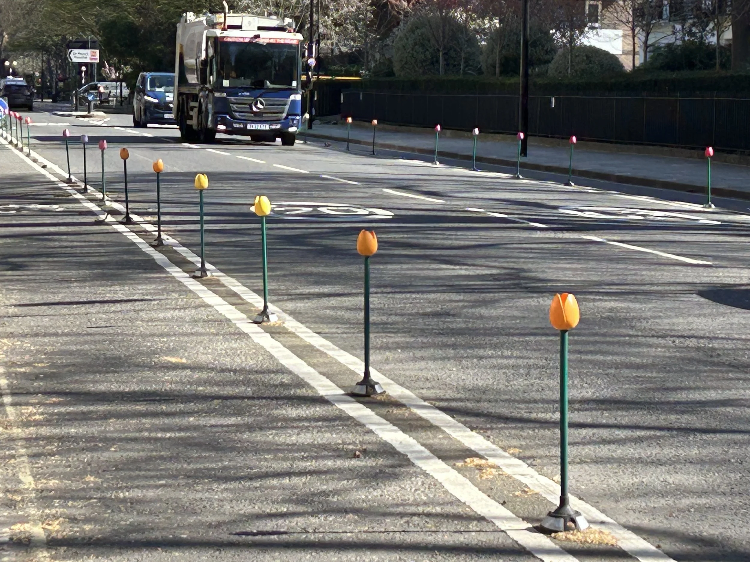 I’m sure you’ve all seen the lovely tulip wands on Sussex Gardens. Personally, I always love a kerb for separation, but then they’re certainly better than no wands, and they do look pretty. And any way we can get Westminster to be a bit more Holland-like is good, if you ask me.